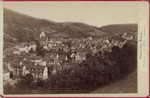 Curator: This gelatin silver print before us is titled “Gezicht op Houffalize met in het midden een spoorweg,” or "View of Houffalize with a railway in the middle" and was created in 1898. Editor: My first thought? Peaceful, but almost melancholic. Like a sepia-toned memory. Everything is muted, as if the town itself is whispering a secret from long ago. Curator: Yes, that muted tone is characteristic of Pictorialism, a late 19th and early 20th-century movement where photographers sought to elevate photography to the level of fine art. Pictorialists often manipulated their prints to achieve painterly effects, blurring details, and creating atmospheric conditions. Editor: It definitely feels hand-worked. The soft focus, the way the light seems to wrap around the buildings...It's not just recording a place, it's evoking a feeling. That railway slicing through the center--almost feels intrusive amidst the nature. Curator: Precisely. Consider how railroads reshaped Europe. The print shows not just a picturesque view, but hints at the influence of modernity on traditional towns. Its position centered almost invites an entry to modern trade and technology. Editor: It is so fascinating how something that seems still can contain that subtle tension. Almost a premonition in silver tones. The choice of medium and the style underscores that conflict for me. You've got the crispness of photography fighting to be a hazy dreamscape. Curator: Absolutely. And its display in a public museum like the Rijksmuseum speaks to the ongoing dialogue between art and its historical context. It transforms it from personal reflection to part of our collective narrative. Editor: This makes you wonder about the lives lived, witnessed by those buildings, before and after that railway changed everything. Makes me wish I had a time machine...with unlimited film. Curator: Indeed. A snapshot of a moment, forever preserved. A place, reshaped and still resonant with a bygone era. Editor: I think I'll carry this hushed view with me. It's a reminder that even in the most serene settings, change is always on the horizon, leaving an artistic impression on how we recall that very moment.