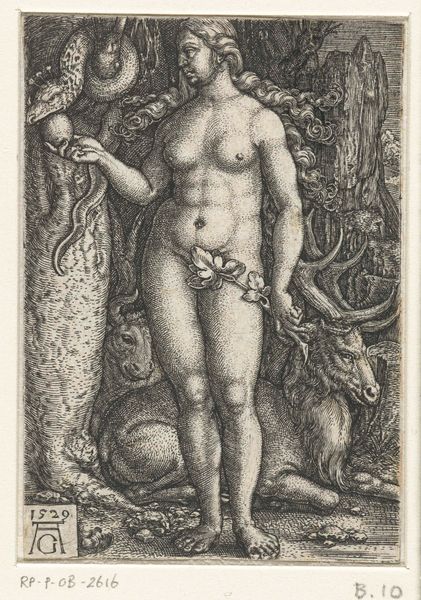 Heinrich Aldegrever made this small engraving, "Eva reikt Adam de Appel onder de boom met de slang", sometime in the first half of the 16th century. It depicts the moment in the Garden of Eden when Eve offers Adam the forbidden fruit. Produced in Germany, the print reflects the religious and social anxieties of the Reformation. Aldegrever was a printmaker in the circle of the "Little Masters," artists who embraced the small scale and precise detail of engraving. His Adam and Eve is more carnal than earlier Northern Renaissance versions. They are surrounded by a variety of animals, including a snake with a human head which symbolizes temptation. The act of offering the apple represents a challenge to divine authority. To understand Aldegrever's print more fully, we can consult theological texts of the period, records of social customs, and the biographies of artists within his circle. These help to contextualize the artwork and to understand the power of art to challenge existing social norms.