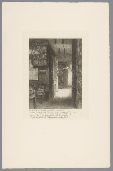 Editor: So, here we have Henri Manesse’s “Trap in het Hôtel meublé de Francfort,” created sometime between 1906 and 1911. It’s a drawing, an intaglio print, made with pencil… The subject is stairs. It has a very shadowy, almost film noir vibe, don’t you think? What catches your eye about this piece? Curator: Absolutely, the dramatic lighting does give it that moody, cinematic quality. You know, for me, it’s the way Manesse transforms the mundane – a staircase in a Frankfurt boarding house – into something compelling. It's as if the building itself has secrets to tell, whispers of past inhabitants etched into those stones. What I appreciate is that it feels so incredibly human – there’s a certain weight, weariness, in those steps. Do you pick up on that too, or am I just projecting my own Monday morning onto it? Editor: No, I see it! It feels well-worn. But what exactly do you think Manesse was trying to communicate through something like a staircase? Is it symbolic, maybe of social climbing or something? Curator: Perhaps, but I see something a little simpler. Staircases connect different spaces, different experiences. To me, this is Manesse trying to capture a liminal space - that threshold between here and there, between one chapter and another. It's that transient moment when everything is up in the air, much like the boarding house itself, or indeed, life! Editor: That makes sense. I hadn’t thought of it that way. I’d been so focused on the shadows! Curator: The shadows are certainly key though. That heavy chiaroscuro lends that mysterious narrative and adds to the sense of place. Remember, many artists at this time were grappling with depicting urban life and modernity in new ways. It seems that Manesse sought quiet corners as a reflection of that dynamic change. So where does your eye lead you? Up those stairs and into what story? Editor: Definitely! I suppose for me, it suggests that you need to put in the effort if you're looking for something else. Thank you for your expertise; I’m leaving this work seeing far beyond the surface.
