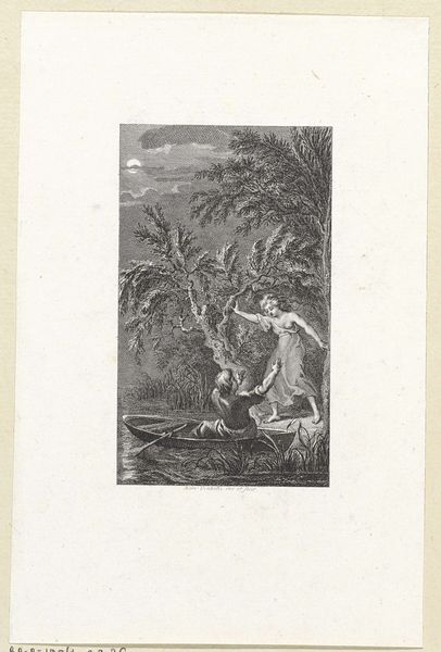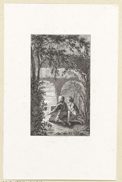 This is Reinier Vinkeles' "Paulus en Virginia in een bos bij onweer", an engraving of modest size now held at the Rijksmuseum. The composition is dominated by the dramatic diagonal of the lightning, which cuts through the dense, almost claustrophobic, forest setting. Vinkeles masterfully uses line and shadow to evoke a sense of foreboding, typical of Romanticism. The figures of Paul and Virginia are small relative to the landscape, emphasizing the power of nature over human endeavors. The zigzag of the lightning, rendered with stark white lines against the dark foliage, creates not just a focal point but also a disruption, destabilizing any sense of idyllic harmony. Consider how the artist’s choice of engraving – with its capacity for fine detail and stark contrasts – enhances the scene's emotional intensity. The forest, with its dense network of lines, seems to press in on the figures, mirroring their vulnerability. Ultimately, this piece is a study in contrasts: light against dark, human vulnerability against nature's might, and the idealized romance set against the harsh realities of the natural world.