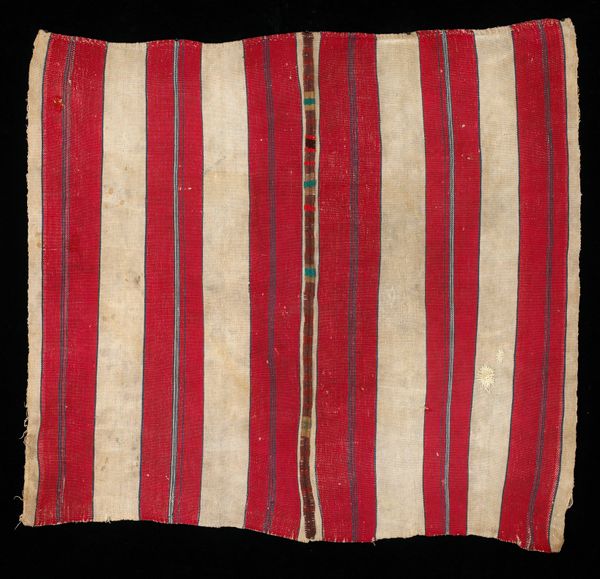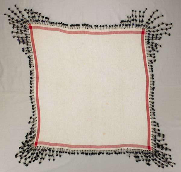 Curator: This is an "Amendil," or head covering, created around the 20th century by the Ida ou Nadif Amazigh people, also known as Berber, and it's currently housed here at the Minneapolis Institute of Art. The piece, primarily crafted from wool textile, showcases the beauty of fiber art. Editor: My first impression? Stripped-down elegance. There's a meditative quality to its geometric simplicity and gentle use of color. Curator: Indeed. Its formal structure, the balance achieved between the undyed wool field and the strong red rectangles, offers a compelling example of minimalist geometric design within textile traditions. One might see echoes of structuralist principles at play here. The tassel embellishments also enhance the form. Editor: I get a sense of practical devotion—almost like a prayer. The wool is probably dyed with natural pigments, creating a very organic effect, a real connection to the earth and their daily routines. Is it too much to imagine the weaver putting prayers into each knot and tassel? Curator: Such interpretations are valid. However, focusing on the piece’s composition reveals an intriguing application of pattern and decoration—elements traditionally linked to Islamic art, a tradition where geometric forms often symbolize deeper cosmic truths. The square shape suggests containment and order, mirroring perhaps the wearer’s controlled demeanor or her protected status within society. Editor: Okay, okay, cosmic truths—I can appreciate the underlying structure, and it grounds my slightly more flighty poetic notions, but it is still beautiful, it feels warm to the touch almost just by looking at it, and there's a sort of… defiance in that boldness of the red that cuts through. Curator: And how the linear perimeter frames the main area adds further definition. One cannot deny how this visual clarity adds to the overall effect, offering a serene viewing experience. The limited color palette emphasizes the focus on form. Editor: For me, it shows how so much meaning can be conveyed using so little. Simplicity as power! It would be fascinating to know the identity of the artist or even just details about her lived existence. What a life! Curator: It encourages an appreciation of how aesthetic restraint can achieve profoundly elegant expressions, particularly within textile forms. Editor: Yes, sometimes less truly is more, or maybe, less *reveals* more. Thank you for enriching this artistic experience, Curator.