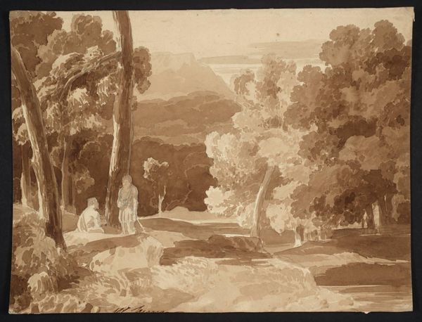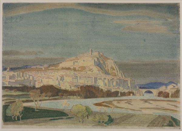 Curator: Welcome to this drawing, "View from the Southern Tower of Viborg Cathedral," crafted by Poul S. Christiansen around 1906. It's a coloured-pencil and watercolor work currently housed here at the SMK. It presents a scene seen from within the cathedral. Editor: It’s remarkably serene, isn't it? There's such soft light bathing the landscape. It's visually framed by these architectural elements of the church itself. I notice the colours have muted tones—was that due to his pigment choices or more related to what was available for purchase back then? Curator: Indeed, those material choices impact the impression the scene imparts to its viewers. As for your comment regarding that framing, framing often reinforces a certain worldview. Think of what a cathedral signifies at the turn of the century; power, community, faith... all filtered and presented to the town below. Editor: Absolutely, and what is shown. Looking down on the cityscape beyond and into the far distance suggests dominance, the all-seeing eye. But those very muted colors diminish that sense of dominion in some ways. Do the colours relate to any known meanings of colours and Danish history? Curator: Consider, too, the use of watercolor and coloured pencils; relatively accessible materials. Perhaps the intention here was not grand pronouncements, but rather to capture the essence of a specific moment, a mood. Watercolour became increasingly popular because it was quick, so what moment and feeling did he look for at that instant, do you imagine? Editor: A gentle moment, I'd say. A blending of earthly beauty with spiritual observation. I'm quite drawn to how those stone columns echo nature’s verticality. There’s a visual language there, one connecting divine structure to human comprehension of that world—and what an image it conveys from that high position. What do you see as its most significant attribute? Curator: The piece exemplifies how limitations of the era affect what we value and create. The materials used reflect the era in many aspects. Editor: A fascinating glimpse into the past, indeed, leaving me to reflect on nature and industry—material production and symbolism meeting across time.