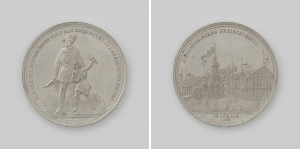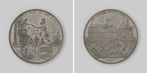 Curator: It’s intriguing to consider this metal engraving from 1752, titled "Begrafenis van Prins Willem IV te Delft" by Nicolaas van Swinderen. The stark imagery almost feels like a memento mori. What strikes you initially? Editor: The starkness definitely gets me. It's also fascinating how such a somber event is captured on what seems like a commemorative medal. How would you interpret the work, given the medium and its subject? Curator: Let's think about the materiality here. Metal as a means to immortalize a fleeting moment. The production of these medals - the labor involved, the resources extracted, and the purpose it served. It’s more than just about aesthetics; it’s about how this object participates in societal rituals of remembrance and political legitimization. This metal engraving, designed for circulation, also tells a tale of accessibility and distribution of power in 18th-century Netherlands. What’s your perspective? Editor: So, you're less focused on the emotional weight and more on the object's social function and manufacturing process? Curator: Precisely. We should also be analyzing the economic and social conditions that enabled this type of mass production for the purpose of political image-making and memorializing figures of power. Editor: It does put the 'commemoration' into a very different, almost commercial light. I never thought about it that way. Thanks, that was enlightening. Curator: Indeed, reflecting on the production unveils the narrative ingrained within the object's existence.