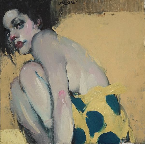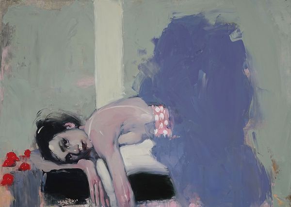 Curator: Milt Kobayashi's "The Wayward Strawberry," painted in 2020 using oil, presents us with an intimate scene. The figure and its placement command immediate attention, don't you think? Editor: It does. The intensity of the red grabs you first, doesn't it? It's the color of passion, of course, but also perhaps of warning – the averted gaze gives the piece a strange mood, almost…troubled. Curator: Indeed. Consider how Kobayashi manipulates the oil paint. The impasto technique gives the figure a tactile quality. The thick layering of the paint, particularly noticeable in the dress and the red backdrop, provides textural contrast against the smoother rendering of the figure’s skin. Note also how the composition itself contributes to the narrative. The wayward strawberry itself in the foreground provides an uncanny detail and contrast with the heavy saturation in the red, further contributing to this dynamic tension within the pictorial space. Editor: Strawberries often represent temptation, or even lost innocence. Given the way she looks away, almost in shame or regret, and that she has seemingly dropped this potent symbol…it seems the artist is hinting at some deeper meaning. And then the use of red - of course a classic colour, associated with vitality and passion. Kobayashi paints the fruit as a symbol that holds the power to ruin a woman's life. This simple, almost naïve portrayal is also infused with tragedy. The whole picture holds something darker and somewhat unsettling. Curator: And while the color is quite evocative, let's focus on the formal decisions. The lines defining the figure are blurred and broken, characteristic of a Neo-Expressionist style, which undermines the idea of stable representation of the subject; it challenges conventional notions of form and figuration. Note, as well, that this departure makes it so we should consider the raw materiality of the oil-paint and color relationships more. The painting isn't necessarily telling a story in the conventional sense, is it? Editor: I disagree with this assertion. Neo-Expressionism uses such formal methods exactly to augment a narrative. The subject in "The Wayward Strawberry" becomes more complicated than just the aesthetic handling of its materials when these factors work in harmony. There is a human story, with real social, cultural, and psychological weight behind its construction, that these symbolic choices underscore. Curator: Interesting... Ultimately, regardless of how we interpret the themes here, Kobayashi challenges our perceptions of portraiture, representation and contemporary figuration through this painting, so I concede there is not one specific direction it seems to be intended to be taken. Editor: It really does capture the feeling that even a fleeting image, and a solitary moment of emotion, can echo across generations.