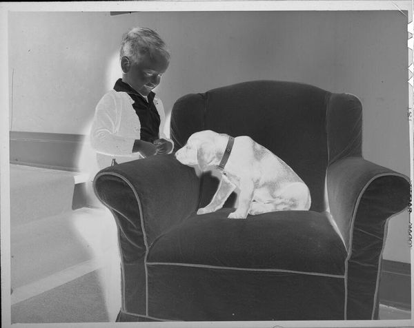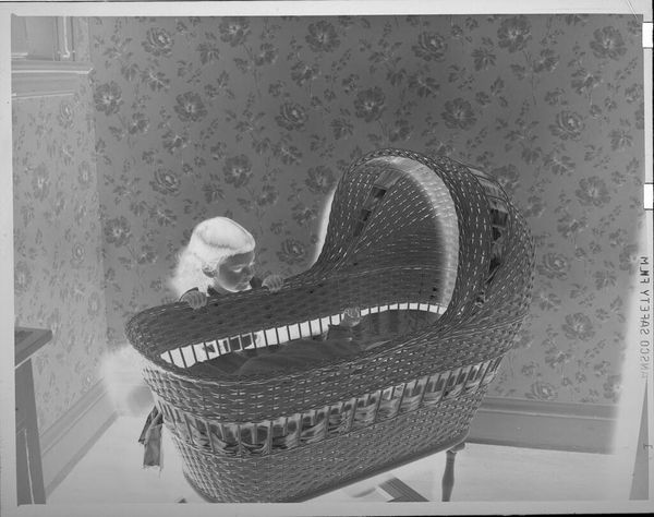 Editor: This intriguing photograph, "Untitled (baby on chair, boy under chair)" by Lucian and Mary Brown, features two children and what looks like an oversized armchair. It's a gelatin silver print. What strikes me most is how the children interact with the domestic space. How do you interpret this work? Curator: Well, given the medium, I see it as an object produced within a specific photographic process, itself a product of industrial chemistry and capital. The choice of gelatin silver print points to certain economic and social possibilities for the artists. Think about the labor involved, from its making to its consumption as a domestic image. Editor: So, you're focusing on the means of production rather than just the image itself? Curator: Precisely! The photograph isn't just a representation; it's a material object embedded in a web of social relations. Considering the economic accessibility of photography during that time adds layers to understanding the photograph's circulation. Editor: I see. So, it's less about the children and more about the conditions that made the image possible. Curator: Indeed, understanding the materiality helps us challenge traditional notions of art, prompting us to consider photography as a form of labor and consumption. Editor: That's a perspective I hadn't considered. Thanks! Curator: My pleasure. It’s crucial to examine the conditions of art's creation.