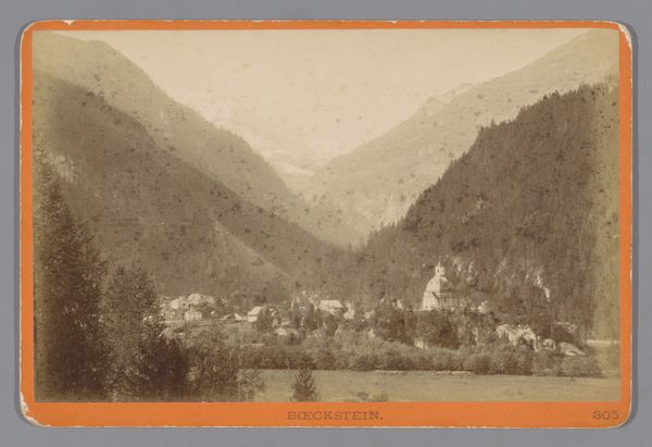 Editor: This gelatin-silver print, attributed to Alexander Flury and titled "Gezicht op Pontresina in Zwitserland," captures a view of a Swiss village, framed by imposing mountains. Dating back to around 1875-1885, the sepia tones lend it a somewhat dreamlike quality. The village seems so neatly nestled within the landscape. What strikes you most about its composition and execution? Curator: Formally, the photograph is interesting for its balance between texture and tone. Note the high contrast between the granular details of the mountains and the smoother, almost velvety, rendition of the sky. This contrast helps define the spatial relationships within the image, guiding the eye from the foreground village up to the imposing mountain peaks. It appears Flury has skillfully managed depth-of-field to render both near and far elements with relatively sharp focus. The tonal range is somewhat limited which impacts our reading, however, the texture across the photographic plane is dynamic. Editor: Yes, I see how that interplay between sharpness and softness creates depth. Does this considered composition relate to pictorialism? Curator: Indeed, it certainly alludes to pictorialist intentions. Pictorialism in photography often attempted to mimic the aesthetic qualities of painting. Consider how Flury has controlled light and shadow to emphasize certain areas and subordinate others. Pictorialists would have focused on these kinds of techniques. Note also how the placement of the village subtly offsets the composition which echoes painting's strategies. Do you feel it succeeds as a visual composition, rather than merely as documentation? Editor: Absolutely. Looking at the texture, especially, I can see the artistic choice beyond simply recording a scene. It's almost a constructed reality. Thank you, that perspective really opened my eyes to appreciate the image on a deeper level. Curator: You're most welcome. It is important to always focus on composition and materiality, not only cultural narratives. I will think about it from an empirical point of view moving forward.