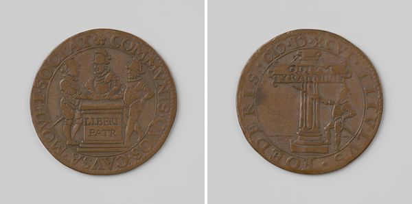Curator: Here at the Rijksmuseum we have a small but fascinating piece attributed to an anonymous artist from 1596. It is a carved metal print titled "Sluiting van het drievoudige verbond tussen Engeland, Frankrijk en de Republiek." Editor: It strikes me as quite solemn for its size, doesn't it? The relief work, while minimal, conveys a great deal of formality. The patina gives it a uniform character. Curator: Absolutely. This piece likely functioned as a commemorative medal or coin, which would have served to not only broadcast a political message, but also document historical events within early trade networks. It signifies the alliance between England, France, and the Dutch Republic against Spain. Editor: I notice on the one side of the coin there are figures surrounding a type of altar. The detailing, for such a diminutive work, is impressive. What can you tell me about the arrangement, the composition itself? Curator: The figures represent the leaders of the allied nations. If you look closer, the central figure represents Henry IV of France, flanked by Elizabeth I of England, and Prince Maurice of Orange. The altar displays the shields of each nation, visually uniting them. And then, look at the coin's other side; it's an image that presents an allegorical representation of tyranny being suppressed. Editor: The inscription around the edge-- is it simply a declarative message of solidarity? Curator: Inscriptions play a vital role in the message here. On the obverse you find the alliance declaration, while the reverse is a rallying cry for freedom "Hatred of Tyranny." Editor: Thinking about the function of such a portable item, the choice of metal as the material feels exceptionally crucial to its dispersal through both geographical space and cultural context. Curator: Exactly. The medals' engravings allow it to be reproduced to spread propaganda regarding politics for an extensive reach, helping shape popular opinion. Editor: It's compelling how this modest object encodes complex geopolitical narratives within its circular form. There’s much contained within that small shape. Curator: It certainly invites us to consider how art, even on this scale, plays a critical role in shaping our understanding of historical and political realities.