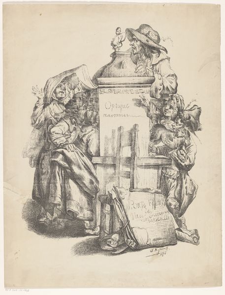 Editor: This is Johan Michaël Schmidt Crans' "Design for a Monument on the Occasion of the Dissolution of Parliament in 1868", a pencil drawing from 1868. The first thing that strikes me is how much it resembles a political cartoon, the way it's mocking and playful. What do you make of it? Curator: You’ve nailed it! There's such playful energy. But beneath the humor, I sense a poignant reflection on power. See how these figures build upon each other, precariously perched? Do you get a sense of what underpins this monument’s design? Editor: It seems like there’s one figure at the bottom being weighed down, almost like they’re trapped. It makes the ‘celebration’ above seem…unjustified. Curator: Exactly! Notice how the lion—a symbol of strength and the nation perhaps—is chained and burdened? This is satire at its sharpest, my friend! It is suggesting that celebrating political events can be a hollow exercise if they're built upon the oppression or marginalization of others. How does this make you feel? Editor: It's powerful. The lightness of the pencil work almost makes it feel casual, like a doodle. The reality of the subject matter is anything but. The artist definitely had something to say, hiding in plain sight. Curator: Yes, and sometimes art speaks loudest when it whispers, doesn't it? An incredible work, showcasing political discourse wrapped in art. Editor: I agree. I learned that political art can be both direct and subtly subversive at the same time.