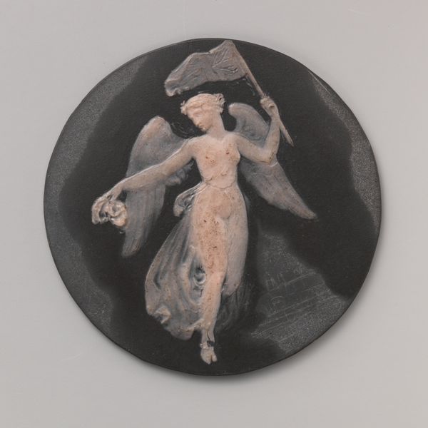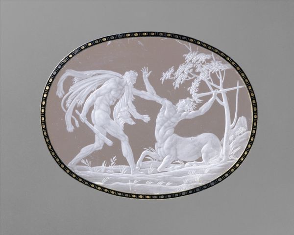 Editor: This is "The Fall of Phaeton" by Adolphe David, dating somewhere between 1850 and 1875. It's a carving made of ivory. I am struck by the dynamism here – Phaeton looks like he is in complete freefall, the horses going wild, the clouds swirling all around. What strikes you the most about this carving? Curator: Ah, yes! It’s quite the dramatic tumble, isn’t it? You know, seeing Phaeton’s fall, I'm reminded of Icarus – another Greek myth about reaching too high, flying too close to the sun. The piece evokes for me a kind of cautionary tale, a meditation on hubris perhaps? I am fascinated by the contrast between the smooth polish of the ivory and the frantic energy of the scene. The artist must have relished bringing such movement to life on such a delicate surface. Doesn't it make you wonder about the challenges of working with ivory in such intricate detail? Editor: Absolutely! I had not even thought about the physical process! It seems so daring. Do you see other symbolic details within this carving? Curator: Definitely! Look closely at the horses—they're not just pulling a chariot. In my view, they are a force of nature unleashed. Each seems to represent primal chaos, right? The fact that they are going against their rider speaks volumes, as a stark counterpoint to man's quest to reign above his station in nature. Editor: That's a fantastic interpretation. So it is the story and the craft of working with such material intertwined that communicate to you? Curator: Precisely! Each telling enhances the other. I am off now to seek my own wild stallions. Bye for now. Editor: That was really interesting. I see it anew! Thanks!