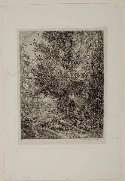 Editor: This is Théophile Chauvel's "Does at Rest", a print currently held at the Harvard Art Museums. I’m struck by the density of the etched lines creating the foliage. What can we say about the production of this print and the materials used? Curator: The etching process, its accessibility compared to painting, democratized landscape imagery. Consider the paper itself, likely mass-produced, enabling wider consumption of art. Chauvel is not just depicting a scene, but engaging in a mode of production tied to broader social and economic shifts. Editor: That’s interesting, I hadn’t thought about the implications of the printmaking process itself. Curator: Exactly. The labor involved, the distribution networks, and the audience's access – all contribute to the artwork's meaning. Editor: I see the art not just in the image, but in the making. Curator: Precisely. Now, how does this perspective shift your interpretation?