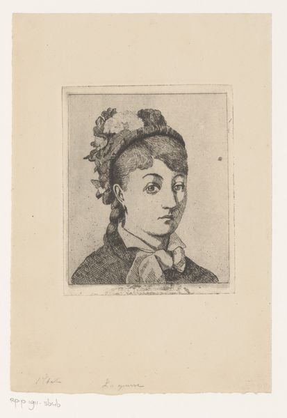This is an etching by G. Laguesse portraying an unknown young woman, with an emphasis on her attire. A striking feature is the bow tied at her neck. The bow, a motif seemingly simple, carries a wealth of cultural baggage. From antiquity to modernity, the tying of knots and bows has symbolized bonds, promises, and unions. Consider the Hercules knot, a symbol of love and commitment, used since Roman times, or even the simple act of tying a ribbon as a token of remembrance. Here, in this portrait, the bow suggests a certain formality, perhaps a hint at social status, but also a binding, an unspoken agreement between the sitter and the viewer. This motif is cyclical, not linear, and continually resurfaces. The bow will return in new forms, each time adapted, each time slightly altered by the currents of history, yet forever tied to its origins.