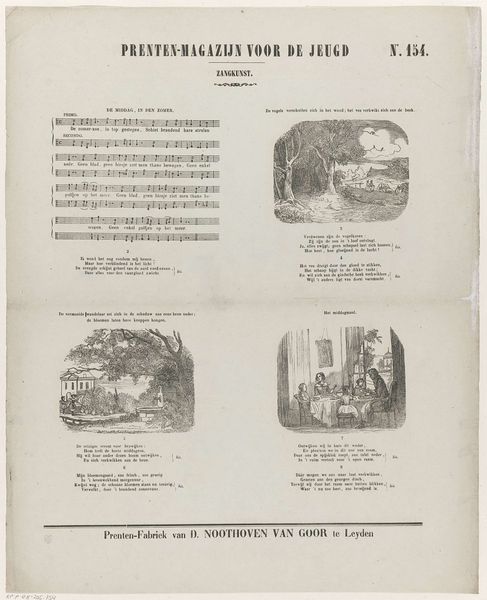 This print titled "Prenten-magazijn voor de jeugd / Zangkunst" was created by Jan Schuitemaker, its exact date is unknown. The print is organized with a clear, almost pedagogical structure, dividing the sheet into distinct panels. This arrangement echoes the format of a magazine, suggesting that it was intended to be viewed sequentially. The use of text, including musical notation, alongside the images combines visual and textual information to deliver a multi-layered experience. The simple use of line and shading creates depth and texture. The landscapes and figures are rendered with an eye for detail, capturing a sense of everyday life and labor. Schuitemaker’s compositions reflect a broader cultural interest in systematization and categorization. Ultimately, the print invites us to consider how visual and textual elements converge to create a narrative and how such structures shape our understanding of the content.