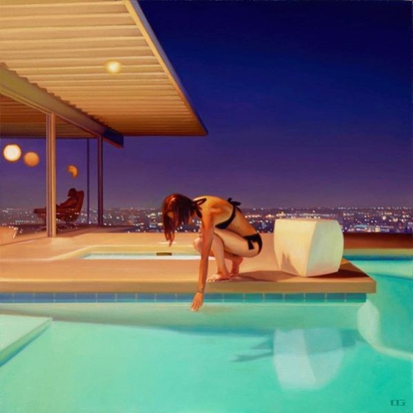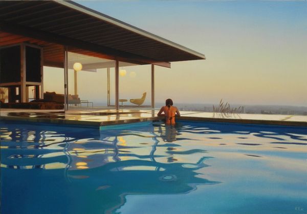 Editor: Carrie Graber's "Gold and Martinis," painted in 2017 using acrylic paint, strikes me as a distinctly contemporary take on leisure. The figure almost melts into the modernist architecture. What symbols and references stand out to you? Curator: Immediately, the color gold demands our attention. What does gold typically signify in art history and cultural memory? Consider Byzantine icons, for example, and its associations with divinity, value, and even artificiality. Does the choice of “gold” in the title lead your reading of the overall scene? Editor: That’s fascinating! I immediately think about wealth, but almost a superficial, status-driven kind of wealth…not necessarily spiritual. What about the martini? It feels so loaded! Curator: Precisely. Martinis themselves evoke a certain cultural weight—sophistication, mid-century elegance, but also perhaps a hint of emptiness or escapism, given the era of this kind of "golden" modernism that it harkens to. Consider too the broader history of drinks in painting, from Bacchus onward. What is this specific drink communicating within the context of the scene and the figure’s pose? Editor: It almost feels like a contemporary re-imagining of classic themes – beauty, leisure, wealth – viewed through a somewhat critical, perhaps even melancholic, lens. The gold could then point to a gilded cage effect. Curator: Indeed! And note how the sharp geometric lines of the architecture, the almost artificial greenery, and the solitary figure amplify this interpretation. It uses familiar symbols to invite us to reflect on how these concepts persist and shift in contemporary culture. Editor: That makes perfect sense. I didn’t see all the cultural layers at first, but now it feels much deeper. Thanks!