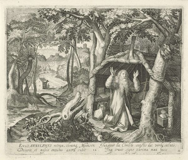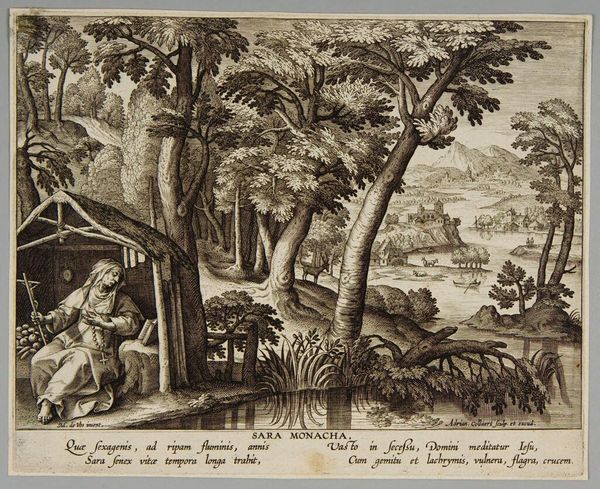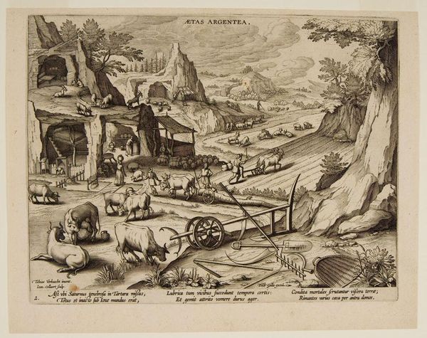 Curator: Hans Collaert the Younger's "The Age of Gold," a plate measuring about 20 by 26 centimeters, presents an idealized vision of humanity's early days. Editor: It feels incredibly fertile and abundant. All these figures lounging nude within a landscape overflowing with fruit and tame animals. It's a utopia of leisure, isn't it? Curator: Precisely. The image draws upon classical sources depicting the reign of Saturn, a period of peace and effortless prosperity before the rise of agriculture and warfare. Editor: I notice how the artist employs a sophisticated, almost allegorical use of natural symbols: the palm represents triumph, the various fruits symbolize abundance, and the lack of weapons—the absence of violence. Curator: Indeed, it's a reminder of humanity's aspirations for a return to simplicity and innocence, though perhaps a bit romanticized when viewed through the lens of historical realities. Editor: It's a powerful image, regardless, filled with symbolic resonance that speaks to our enduring yearning for harmony. Curator: Agreed, it provides a fascinating window into the social ideals of the era.