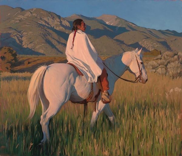 Mark Maggiori painted "Under the Pueblo Sky," at some point in his career, but who knows when exactly? What strikes me right away is how the artist has revelled in the detail of the horse, rider and landscape. The texture of the horse’s coat is so smooth that I wonder if the artist used glazing techniques, layering thin washes of paint to build up the highlights and shadows. Up close, you can almost feel the light reflecting off its coat. This is in contrast to the heavy, almost opaque brushwork in the sky. The artist has used the contrast between brushwork and subject matter to make the horse and rider feel like a tangible presence, set against an infinite, light-filled space. The way the rider is looking out into the distance makes me think of a painting by Frederic Remington. It's fascinating how artists keep revisiting similar ideas in different ways. Ultimately, it is up to us to find our own meaning in the work.