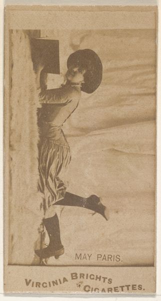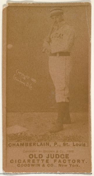 Curator: The sepia tones of this baseball card immediately evoke a bygone era. We're looking at "Porter, Pitcher, Brooklyn, from the Old Judge series (N172) for Old Judge Cigarettes," dating from 1887 to 1890 and crafted by Goodwin & Company. What are your initial thoughts? Editor: Well, besides the fact that someone needs to teach me how to do a backflip, I’m struck by the unusual composition. One player reaching up while the other is airborne... I can practically smell the cigar smoke and the leather of their gloves! This was pure marketing strategy leveraging new sports celebrity. Curator: Indeed. Note how the photographer has positioned Porter. There’s a clear articulation of form, emphasizing his body in motion. It almost reads as a sequence, isolating two phases of a single action into separate, distinct images presented together, creating an appealing visual rhythm. Editor: Interesting! I'm drawn to the idea of how the photographer staged this. Goodwin and Company were mass-producing these cards to sell tobacco products, weren't they? You can almost imagine the studio setup: the makeshift backdrop, the ballplayer posed multiple times for the camera. We’re talking about early sports memorabilia being directly tied to an emerging consumer culture. Curator: Precisely. This tension between the candid sporting moment and carefully constructed imagery is crucial. It highlights the dual nature of early photography - both document and construction. Observe the almost classical arrangement, too, in relation to painting conventions of the era, like portraiture. The framing provides a sense of monumentality despite its relatively small scale. Editor: But, it also speaks to the democratization of image making! Suddenly, photography offered this possibility for the working class to become enmeshed with what they saw, smoked, and valued. Goodwin and Company put labor in focus--literally through photographs. This also highlights how value is produced. These cards would have been worthless if it weren’t for these figures like Porter demonstrating prowess, talent, and sheer grit! Curator: I agree. It showcases a fascination with athletic prowess. Looking at this photograph through the lens of advertising offers fascinating insights into how desire and aspirations were cultivated through mass production. It also serves as a reminder that photographic conventions shape how we see even so-called ‘natural’ actions like pitching a ball. Editor: So next time I’m contemplating buying cigarettes or a piece of sports history, I’ll remember Porter's floating form – a testament to labor, marketing and art intertwined. Curator: An elegantly formed synergy! Thanks for helping to illuminate these multiple dimensions inherent in the structure of this piece.