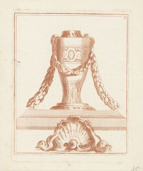 Curator: Here we have an engraving dating from after 1703, entitled "Vaas met de triomf van Amphitrite" or "Vase with the Triumph of Amphitrite." It's an anonymous piece in the Rijksmuseum collection. Editor: It strikes me as intensely formal, almost severe. The vase is incredibly ornate, and the monochrome etching gives it an austere, almost academic quality. Curator: The artist, despite being unknown to us, demonstrates superb skill with line. There’s remarkable precision in rendering the intricate carvings. We see influences from the decorative arts and Baroque aesthetics—the emphasis on elaborate detail and complex forms is undeniable. Consider how this style reflected power. Editor: That triumph, as you say, isn't just about the vase, it's about projecting power, and I agree the vase seems secondary here. That’s intriguing. It invites one to consider Amphitrite, a relatively obscure sea goddess whose marriage to Poseidon calmed the seas, as less a figure of triumphant power and more a political actor, whose influence serves a social function in an allegory on leadership and calm ruling. The sea imagery certainly reinforces her domain. Curator: Indeed, the iconographic choice is powerful. I’m fascinated by how artists utilized classical myths to reflect on the political circumstances of their time. Images like these circulated through print, impacting social views far beyond their original aristocratic contexts. The visual vocabulary conveyed specific moral and political messages that society actively debated. Editor: And its purpose goes beyond decoration—these symbols become a language of cultural memory. I imagine educated viewers in the 18th century instantly recognized Amphitrite's connection to the sea, dominion and rulership, instantly interpreting and processing how to react to and process its political subtext. We could almost use this object as a prism, shining a light into a certain perspective about governance and power within that specific slice of history. Curator: Precisely! The vase embodies not merely the aesthetics of the period but also the social, cultural and power structures prevalent in that period. Looking at it reminds us of art's central place within a complex political theater. Editor: It's more than just decoration then, and more than just mythology; it is a dialogue within historical conditions and culture.