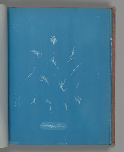 Curator: Editor: Here we have Anna Atkin’s *Jania rubens*, created between 1851 and 1855. It's a cyanotype, so a very early form of photography, made using paper and light-sensitive chemicals. It is currently located at the Metropolitan Museum of Art. The stark contrast between the cyan blue background and the delicate white seaweed creates a wonderfully simple image. How should we interpret this? Curator: Considering Atkins' cyanotypes, let’s look at them in a Materialist context. Forget, for a moment, about inherent beauty, and look instead at the materials, the production. Why cyanotype? What did this relatively inexpensive method offer Atkins that other, perhaps more refined, photographic processes couldn't? And who was she producing this *for*? Editor: It feels almost like scientific documentation…like a study? Maybe the accessibility of cyanotypes allowed her to document specimens in a way that was both artistic and, dare I say, efficient? Was it a common process? Curator: Exactly. Remember, this was the mid-19th century. Photography was still quite new. The cyanotype process was relatively simple and didn't require a darkroom or complex equipment, things that would require money and power that many woman in science, like Atkins, would not have readily had available. It was a cost-effective way to produce multiple copies, perfect for sharing information within the scientific community. Furthermore, look at the context. Editor: Okay, so its distribution makes it something more than a simple study then? Curator: Precisely! Now consider, the presentation of Atkins’ photographs in book form – *Photographs of British Algae: Cyanotype Impressions*. Was this artistic intention or accessible, scientific data? This also gives us insight into the labor, skill, and economic factors involved in creating and distributing knowledge at that time. The question of high art versus functional craft becomes extremely interesting. Editor: So, the "beauty" isn't just aesthetic; it's embedded in the process itself. I now see a reflection of available resources in Atkin's decision making. Thanks! Curator: Precisely! That makes it so rewarding to discuss this piece. We were able to dig into the making, and that sheds so much light on its meanings.