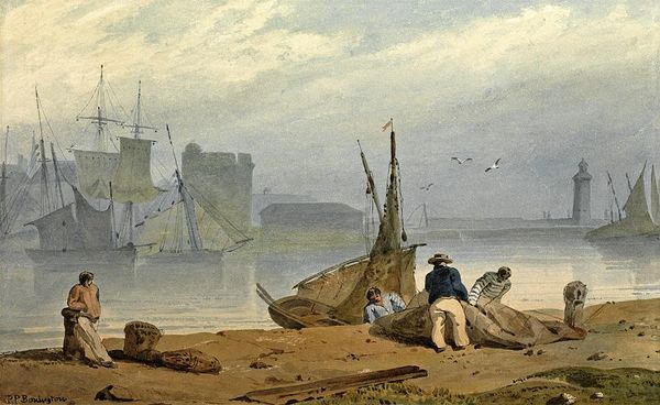 Editor: This is "Calm off the Coast of the Isle of Wight," an oil painting by George Morland, dating back to 1804. I find the painting surprisingly tranquil. What do you see in this piece? Curator: What I see here is a romanticised view of coastal life in England, painted during a period of intense social and political upheaval. Think about it: Morland is painting this picturesque scene, but what voices are missing? Where are the signs of labour, of economic struggle, of the colonial realities that were shaping British society at the time? This calm feels deliberately constructed, a kind of escapism. Editor: So you're suggesting the "calm" is actually obscuring something? Curator: Exactly. This scene of leisure is positioned against the backdrop of empire, an empire built on exploitation and inequality. Where are the working class people here? What about the islanders of colour that colonialism was displacing, whose land was exploited for resources? The artist is not just painting a scene. It’s a choice, a very deliberate representation of reality. Does it make you question your initial perception? Editor: It does, actually. I hadn’t thought about what wasn't being shown. The tranquility now feels…almost complicit. Curator: And that tension is precisely what makes analyzing art so vital! Recognizing that these idyllic scenes often mask harsher realities helps us engage critically with both history and contemporary social issues. Editor: I'll definitely remember to look for those hidden narratives in other landscapes as well. Thanks!