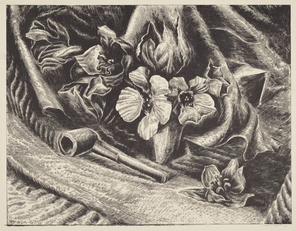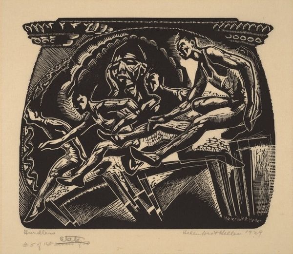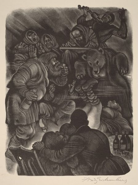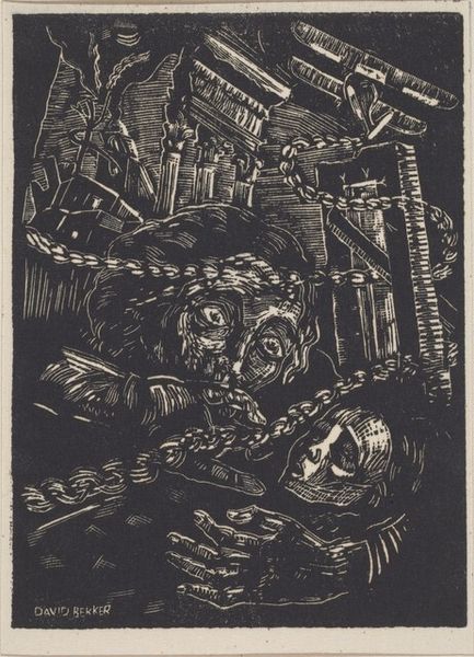 Editor: Here we have Jose Clemente Orozco’s "Machines", a lithograph from 1935. It's a pretty stark image – full of hard lines and contrasting tones. I’m struck by how Orozco juxtaposes the geometric shapes of machinery with human faces that seem to be caught between laughter and despair. How would you interpret this work? Curator: Well, for me, the core of this image lies in the material dialectic. Orozco's lithograph forces us to consider the means of production during the rise of industrialization. It challenges us to examine not just the aesthetic of machines, but their profound impact on human labor and lived experience. The stark contrast you noticed is not just visual; it reflects the social chasm created by mechanized progress. Editor: So you're saying the machinery isn’t just background, it's central to understanding the work’s message? Curator: Precisely. Consider the process of lithography itself - a technology enabling mass production. Orozco is using a tool of industry to critique industry, to show the psychological toll exacted by these very “Machines.” These aren’t joyful faces; they’re contorted, almost dehumanized, by their entanglement with the mechanical. Editor: I see your point. So it’s a critique of the social costs, disguised as art. But what about his choice to depict the machines as almost anthropomorphic, and the humans as, well, mechanized? Curator: This visual inversion is critical. Orozco is visually blurring the boundaries between humans and their creations. Who is controlling whom? This piece implicates everyone within the sphere of industrialization; it reflects an inherent tension between creative ingenuity and its unforeseen consequences. Editor: That makes sense. I initially just saw the visual impact, but understanding the role of industry, labor, and even the printmaking process itself gives it so much more weight. Curator: Exactly. Examining art through the lens of materials and social conditions reveals hidden depths, doesn’t it?