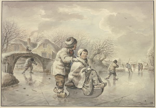 Curator: This watercolor is "Postilion on Horse in a Winter Landscape" created between 1793 and 1803 by Wilhelm von Kobell. There’s such a sense of stillness in it, almost dreamlike. What stands out to you initially? Editor: It does feel quiet, like the snow has muffled everything. What really grabs me are the everyday figures—the postilion, the shivering man and boy. How would you interpret them? Curator: Considering the period, and the choice of watercolor as a medium, I'm interested in how Kobell approaches the idea of landscape as a marketable commodity. Think about it: landscape painting became increasingly popular among the rising merchant class. This watercolor, easily reproducible as a print, offers a picturesque scene depicting labor in a softened, palatable way. It speaks volumes about how artists like Kobell were responding to market demands. Does it change how you see the scene? Editor: Absolutely. Knowing it could be easily reproduced highlights the commodification of even harsh realities. So, the medium influences the message. Are you suggesting the beauty almost masks the struggles of working in such conditions? Curator: Precisely! And watercolor, quick and relatively inexpensive, democratizes image-making in a new way. The ability to be reproduced also impacts the meaning. It wasn't about creating a singular, precious object, but about broader dissemination of an idea of landscape, labor, and leisure that appealed to a wider consumer base. Editor: It’s fascinating to think about art responding so directly to economics. I hadn't considered watercolor as potentially subversive in that sense. Curator: Exactly! And consider who has access to what and how an artist like Kobell challenges what are historically rigid constraints of artistic making. These 'minor' media carry social and economic meanings. Anything else standing out? Editor: I keep coming back to those figures trudging in the snow. I wonder how they would feel about being part of a landscape someone would hang on their wall? Food for thought. Thanks so much for your perspective. Curator: And thank you, it’s enriching to revisit assumptions about artistic media and production.