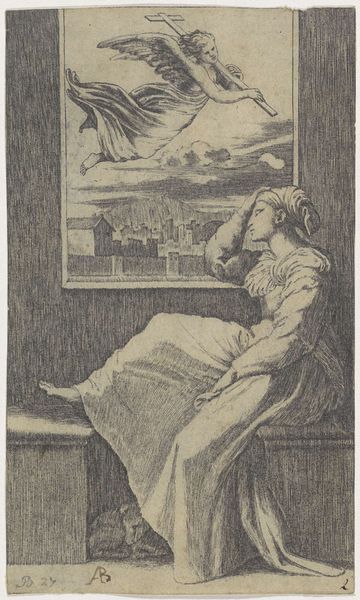 This anonymous engraving, "Vision of Helena," presents a composition divided between the earthly and the ethereal, rendered through precise, deliberate lines. Helena sits, seemingly in contemplation; her form is solid and weighty. Above, an angel floats within a framed vision, offering a cross that disrupts the architectural linearity of the city below. The artist uses line to create texture and depth, particularly in the drapery and the urban landscape. The engraving’s formal structure invites semiotic interpretation, where the cross carried by the angel acts as a powerful signifier of spiritual insight. The contrast between Helena’s grounded pose and the angel's weightless flight challenges fixed perspectives, suggesting a fluidity between the material and spiritual realms. Notice how the rigid lines defining the built environment below contrast with the softer, flowing lines of the angel’s robes. This juxtaposition is not merely decorative; it posits a dialogue between divine intervention and human construction. The engraving uses the formal arrangement of space and line to explore the negotiation between faith and earthly existence.