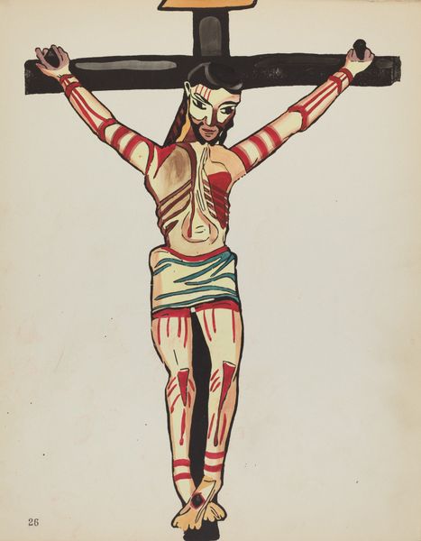 Curator: Before us, we have Majel G. Claflin's "Wooden Christo, Painted (Front view)", created around 1937, rendered in watercolor and drawing over wood. The artist has deftly combined sculpture and drawing media to create this evocative composition. Editor: My immediate impression is one of profound melancholy, almost starkness. The blood is striking, yet the color palette remains muted. I wonder what this contrast signifies? Curator: I find the deliberate flatness of the painted rendering noteworthy, particularly given the sculptural form. Notice how the artist doesn't attempt to disguise the woodenness; rather, they emphasize it with distinct planar shifts and delineated edges. Semiotically, this draws attention to the artifice of the representation itself. Editor: Indeed. It seems to deliberately invoke traditional Spanish Colonial religious folk art-- Santos carvings-- where the material itself possesses spiritual weight. The figure of Christ becomes more accessible, almost humble in its materiality. It pulls you into a very old tradition of embodying faith through wooden sculpture. Curator: Precisely. This tension underscores a critical element of Claflin's methodology. She is aware of tradition, but she deliberately invokes flatness and an expressive awkwardness that seems purposefully modern. It eschews purely naturalistic representation. Editor: The bloodied wounds—almost calligraphic in their application—are hard to ignore. They're less about literal depiction and more about emotional evocation, calling forward centuries of artistic expression surrounding suffering and sacrifice within this religious framework. It’s very raw in emotional intensity. Curator: True, and notice the near geometric nature of the torso. She’s stripping it down, removing embellishment and superfluous detail in order to foreground the very core, if you will, of both Christ and art. Editor: Well, thinking about the broader arc of religious iconography, one can't help but feel moved by how Claflin engages with familiar motifs of Christian art but makes this symbolic image intensely human. Curator: So, we've traversed from a structural perspective, analyzing composition, line and the treatment of planar surface to see something deeply evocative with resonances throughout centuries of religious belief and the rendering thereof. Editor: Quite so. I leave contemplating how this image acts as both artifact and intensely personal expression, a convergence which resonates powerfully even today.