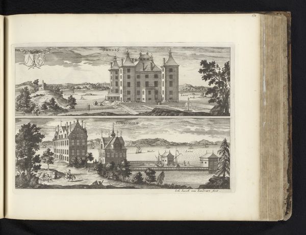 Editor: Here we have Willem Swidde's "Gezicht op landgoed Tuna en slot Stjärnorp," from 1697. It looks like it’s an engraving or print, showing two estate views. I'm struck by how detailed the landscape is. What jumps out to you when you look at it? Curator: For me, it's the power dynamics embedded within this seemingly placid landscape. We’re looking at carefully constructed representations designed to project power and status, not objective views. Consider the positioning of the estates relative to the viewer—elevated, imposing. Swidde's image serves as propaganda, reinforcing the existing social order by showcasing the grandeur and control of the elite over their land and the people within it. What purpose do you think such images served? Editor: I suppose it's about showing off wealth and status, almost like a real estate brochure of the time. Would these have been publicly displayed, or circulated among a smaller, wealthier circle? Curator: That's an excellent point. These images probably weren't hung in the town square, so to speak. Their circulation would likely have been limited to those with an interest in or connection to these estates and, more broadly, the aristocratic class. The printing itself represents access to technologies that commoners did not have, further creating distinction through art production. Who benefits from circulating images of grandeur? Editor: It’s fascinating how much history can be packed into what at first seems like a simple landscape drawing. The act of portraying a place in this way gives the owners authority. Curator: Precisely. It prompts us to consider art not just as aesthetic expression but as a tool in the ongoing negotiation and performance of power. The subtle politics of imagery! I will certainly be paying closer attention to art in historical contexts after learning this. Editor: Absolutely, I hadn't thought of landscape art in that way before; seeing it as a reflection of power struggles really enriches the experience.