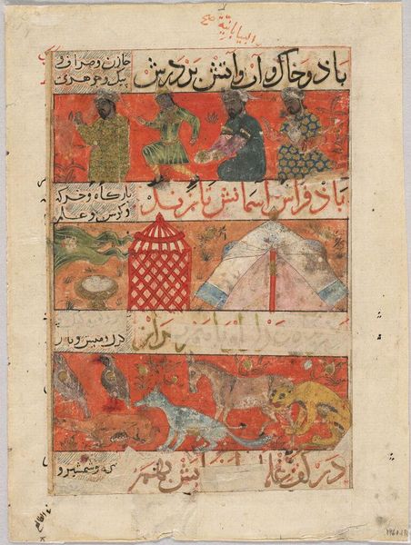 Editor: This Illustrated folio from "The Free Men's Companion to the Subtleties of Poems" presents a grid of figures and symbols. It feels like a page of secrets. What stories do you see in this artwork? Curator: This folio showcases the fascinating intersection of art, literature, and cosmology in Islamic culture. Texts like this weren't just read; they were experienced. Consider how such vibrant imagery would shape the understanding and memorization of poetry. Who do you think would have viewed this folio? Editor: Perhaps scholars or those connected to the court? Curator: Precisely. The presence of royal symbols suggests a connection to power, while the detailed imagery indicates a cultivated audience. These folios functioned as visual tools in the public sphere of poetry and cultural life. Editor: I hadn't thought about the artwork's role within society. Curator: Understanding art's cultural function is key. It encourages us to look beyond aesthetics and see the artwork as an active participant in its time.