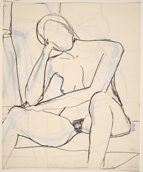 Curator: Here we have Richard Diebenkorn's "Untitled [female nude seated cross-legged on a stand]," a pencil drawing likely created between 1955 and 1967. Editor: My initial thought is how casual the pose is. There’s a certain vulnerability, yet also a quiet strength, conveyed in the lines. You can see the material presence of the model sitting for a drawing. Curator: Absolutely. The pose evokes classical reclining figures, a Venus perhaps, but grounded in an almost domestic reality. Note how the artist uses the cross-legged posture— a position filled with meditation traditions across different cultures—yet also one of apparent ease. It's fascinating how the figure’s nudity takes on added dimensions, no longer solely erotic. Editor: The immediacy of the pencil strokes adds to that sense of reality, doesn’t it? You can almost feel the artist’s hand moving across the paper. I am particularly interested in the raw quality of the pencil lines. They are not precious or overworked, giving the figure an almost fleeting quality as an effect of how a material process becomes artistic intention. Curator: Yes, it gives us a glimpse into Diebenkorn’s process, a study in capturing form and essence. I feel that a simple medium opens up a depth of psychological and physical meaning. Consider that such direct media such as pencil might be an exploration of reality itself. Editor: There's also something about the economic nature of the medium. Pencil and paper—readily available, affordable. I wonder about Diebenkorn’s access to other materials, or his conscious choice to work with something so fundamental. Could it represent his attempt at reducing representation to its bare essentials? Curator: Perhaps, it brings to mind the way pencil, or drawing in general, is also taught for younger artists, creating connections across different eras. The artist may return to it time and again. A way to find or re-find meaning? Editor: It really does. It forces me to reconsider value – what makes something ‘high art’ versus ‘mere sketch.’ Diebenkorn elevating the everyday through a simple medium prompts questions of how we assign worth to labor and materials in art production. Curator: Indeed. A re-evaluation, using time honored symbols within everyday reach. Editor: It is a captivating approach for those who see art’s symbolic and the maker’s intentions intertwined.
