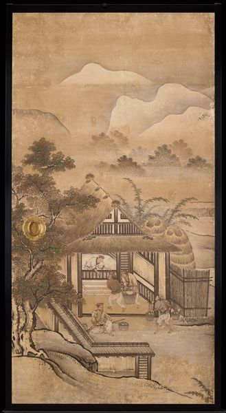 This is "Fall," part of Kano Sanraku’s "Rice Farming in the Four Seasons" set, painted in ink and color on paper. The composition strikes one immediately with its spatial ambiguity, where near and far seem to collapse into one another. Sanraku masterfully uses the monochrome ink to evoke a tranquil autumn scene, with human figures at the bottom set against a backdrop of softly rendered mountains. The bare tree to the right frames the scene, inviting the viewer to enter a world where labor and nature coexist. The artist plays with perspective, compressing the depth of field, which lends to an almost dreamlike quality. Consider how the meticulous brushwork and subtle gradations of ink wash create texture, and how the careful arrangement of elements directs the eye. The balance between the detailed foreground and the hazy background encourages contemplation, not just of the scene depicted, but of the artistic process itself. Sanraku transforms simple ink into a complex language, where each stroke carries both descriptive and expressive weight.