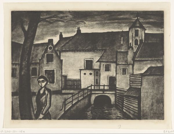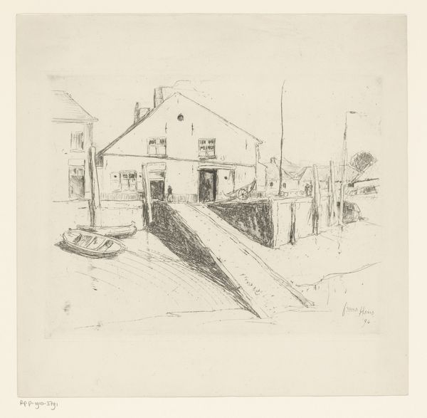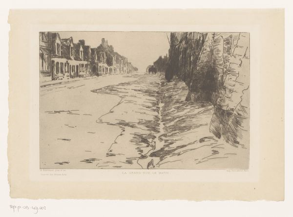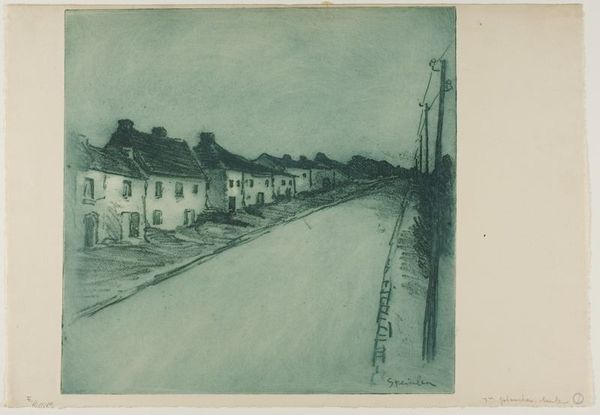 Théophile Alexandre Steinlen created this print, 'Road Through a Village', using etching and aquatint. The composition is immediately striking, with a road that cuts diagonally across the frame, leading the eye deep into the village. The monochromatic palette, save for the subtle red and green accents in the doorways and shutters, creates a subdued, almost somber mood. Steinlen employs a fascinating interplay of light and shadow. Notice how the etched lines create a textured sky, contrasting with the smoother tones of the road. The aquatint technique allows for subtle gradations of tone, giving depth to the simple, box-like structures of the houses. Steinlen's choice of perspective and his attention to the materiality of the scene invite us to consider the relationship between the individual and their environment. The road, a signifier of movement and connection, is juxtaposed with the static, almost uniform houses, inviting us to reflect on themes of community and isolation, progress and stagnation. It's a compelling reminder that art lies in the act of seeing and interpreting.