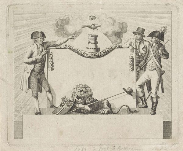 Curator: Here we have an interesting print titled "The Surrender of Earl Cornwallis (Lieutenant General of the British Army in North America) to General Washington & Count De Rochambeau, on the 19th of October, 1781", created between 1781 and 1783. Editor: It's stark, almost austere. The somber grayscale palette and the sheer number of figures involved—it lends a sense of weighted significance, doesn’t it? What’s it made from? Curator: The work is rendered as a print, with details suggesting pencil work on toned paper, watercolour illustration and pen-ink sketching. Editor: Knowing that it's primarily pencil sketch alters my view of its intentionality. Was this intended as a preliminary study for a larger painting or a work unto itself, disseminated via printmaking to shape public opinion about the event? Curator: The socio-political ramifications are certainly central. The image, displayed now at the Met, depicts a pivotal moment in the American Revolution. But let’s consider whose story is amplified here. Washington stands tall, almost regal, receiving the literal surrender, while Cornwallis is portrayed with evident defeat. Editor: Absolutely, this is visual rhetoric at its finest, framing the birth of a nation through the symbolic act of relinquishing arms. Looking at those flags and drums, these are the spoils of war and tangible expressions of power dynamics, signifying a shift in global influence. The act of creation, of printing these images, extends the battlefield beyond the physical space to the realm of perception, disseminating a specific narrative. Curator: And that narrative touches upon themes that still resonate today: resistance, liberation, and the very construction of national identity. This event has been immortalized through meticulous reproduction, transforming historical actors into icons within a broader narrative of political and social change. It causes us to reflect on the concept of historical truth and the role of image making within ideological frameworks. Editor: Thinking about the labour involved—the papermaking, the engraving, the inking—it reinforces the revolutionary spirit embedded in the American project, which can be understood as a collective exertion of individuals working toward liberation, a sentiment that transcends mediums and movements throughout history. Curator: So while we're looking at what seems like a static image from the late 18th century, its materiality connects it directly to foundational social and political ideals. Editor: Yes, its value resides not just in historical documentation, but also its ability to engage us in the perpetual reimagining and reassessment of cultural values and revolutionary movements throughout history.