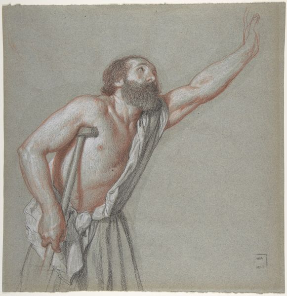 Editor: Here we have Giovanni Battista Piazzetta's oil painting, "Bust of a Man (Saint Matthias?)," created between 1715 and 1720. I'm immediately struck by the dramatic lighting; it creates a really intense and somber mood. What stands out to you in terms of its composition and the use of light? Curator: Indeed, the Baroque sensibilities are at play. Consider the stark contrast – chiaroscuro – between the illuminated flesh and the dark background. This directs our focus entirely onto the subject's pained expression and gesture. The fabric, painted with loose strokes, acts as a textural counterpoint to the smoother handling of the skin. Note how the composition lacks extraneous detail, compelling an almost visceral reading. Does the interplay of light and shadow elicit a certain psychological state? Editor: Absolutely. The dramatic use of light enhances the emotional impact, like a spotlight is aimed at a specific moment, which is very theatrical. But, if we strip that away and just think of light, the geometric arrangement is equally important; a diagonal that cuts across the canvas to brighten the shoulder and lead to his head, the focus is not only on the suffering but its arrangement. Curator: Precisely. This orchestration of light is neither arbitrary nor symbolic, but a highly structured and deliberate formal strategy. The surface qualities, impasto of the paint itself, become part of the expressive content. Have you considered the implied narratives suggested merely through formal elements, without historical reference? Editor: I hadn’t thought about the purely formal components divorced from historical content but seeing the use of chiaroscuro to draw the eye makes me think of all the geometric decisions that went into it. Thanks. Curator: Exactly. Focusing on form allows new ways of interpreting visual meaning.