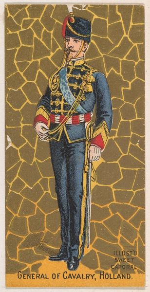 This small chromolithograph of Marshal Ney was made by the Kinney Brothers Tobacco Company, sometime in the late 19th century. Printed on paper, the image shows the French military commander in his full regalia, with a smaller scene of him on horseback below. Chromolithography allowed for mass production of colorful images, making them accessible to a wide audience. In this case, the print was used as a promotional item, inserted into cigarette packages. The process involved creating a series of lithographic stones, one for each color, and then printing them in sequence. This required skilled labor and careful registration to achieve a detailed and vibrant image. The print's small size and mass-produced nature speak to the rise of consumer culture and the use of art in advertising. It challenges traditional notions of art as a unique and precious object, instead highlighting its role in the wider social and economic landscape. By considering the materials, making, and context of this image, we can better understand its full meaning and significance.