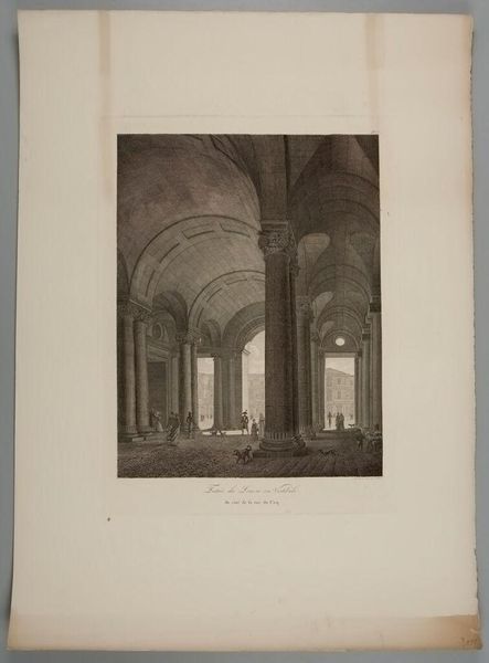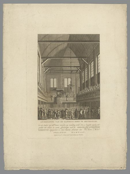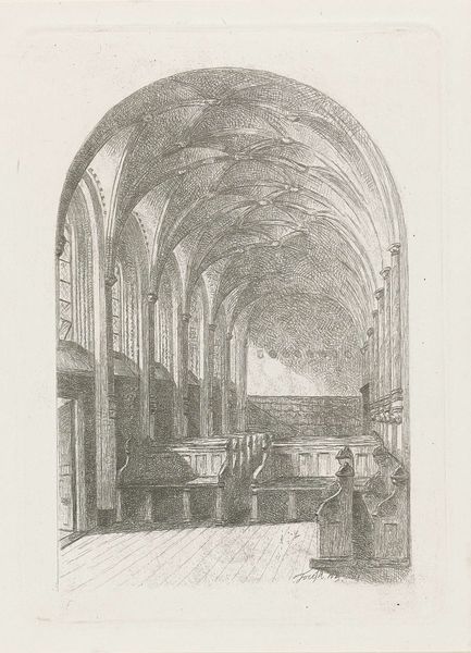 Curator: This is A. M. Huffam's "Interior of a chapel, with the ceremony of a nun taking the veil," housed here at the Harvard Art Museums. The print captures a moment of great solemnity. Editor: It strikes me as quite claustrophobic, even oppressive. All those figures shrouded, the stark, unwavering lines of the architecture... Curator: Notice how Huffam uses the printmaking process to emphasize the architectural elements—the arches, the way the light falls. It speaks volumes about the social construction of sacred space. The labor involved in creating such controlled imagery is also worth noting. Editor: Agreed, and I see it as a powerful depiction of institutional control over women's bodies and destinies. The ritual feels less like a spiritual calling and more like a formal submission. Curator: A submission that required considerable resources to produce and disseminate, remember. Editor: Well, that's given me a lot to think about regarding the dynamics of power at play here. Curator: And for me, it highlights the material conditions through which these dynamics were, and are, made visible.