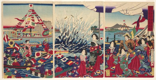 Curator: What a scene! "The Demon Omatsu Kills Shirōsaburō in the Ford," created around 1886 by Tsukioka Yoshitoshi—it’s a woodblock print pulsing with energy. Look at how the water swirls, almost vibrating. Editor: It strikes me as theatrical—a tableau frozen mid-narrative. The figures, especially the woman, seem almost too composed, like actors on a stage, which is ironic given how chaotic the river appears to be. What sort of tale is unfurling? Curator: A gruesome one, though gorgeously rendered. The print depicts a dramatic moment where Omatsu, possessed by a demon, is in the process of slaying Shirōsaburō as he attempts to carry her across the river. The look of agony is etched right onto the poor guy’s face. Editor: I notice the sharp contrast between the victim’s visible distress, mirrored in his taut facial muscles and straining neck, and the woman’s expressionless countenance. Her face feels less like a moment of possession and more like a carefully crafted mask. Does Yoshitoshi aim for purely illustrative effect or try to depict demonic power? Curator: I feel it's both. I see the demon not as literally real, but as an exploration of internal psychological turmoil represented by external forms, right? He blends Ukiyo-e traditions with his own raw vision of the horrors within the human heart. His color choices are quite stunning and not true to reality. He may be highlighting the unreality of a mental space being manifested onto an otherwise ordinary ford. Editor: He certainly masterfully uses color as both structure and visual shorthand here. Take the bold blues in the water: they aren't merely representational but structurally crucial, defining depth and directing our gaze to the turbulent focal point, even though it does create this contrast that doesn't reflect the light. Is the demon metaphor speaking to how social ills become ingrained realities? Curator: Absolutely, or even how one's repressed emotion becomes violence—metaphor turned visceral! And look closer: the detail in the kimono juxtaposed with the rough strokes of the water; there's beauty interwoven even within these brutal scenes. A harsh but stunning commentary on what torments people when we’re alone or caught by surprise. Editor: Right. It feels both hyperreal and utterly staged, forcing us to confront a brutal act of possession, yet simultaneously questioning its own reality. Thank you for your insights. Curator: And thank you; these old prints always offer something new to ponder.