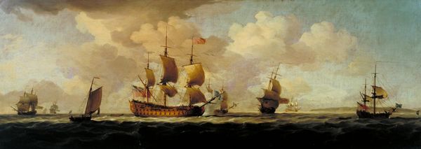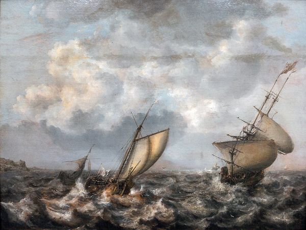 Editor: Here we have a captivating marine scene, "Statenjacht and Other Ships on Rippling Water," by Simon de Vlieger, rendered in oil on canvas. It gives off a strangely calming yet melancholic feel, the grayness, perhaps. What captures your imagination most when you look at it? Curator: Ah, the Dutch Golden Age...It's like stepping into a salty breeze, isn't it? What strikes me is the dance between realism and atmosphere. De Vlieger wasn't just painting ships; he was painting light itself, reflecting off the water, clinging to the clouds. It’s almost as though he wants you to feel the vastness, the tiny, fragile human endeavor against the immensity of the sea and sky. Don’t you think? Editor: I suppose! I hadn’t thought about the “fragile human endeavor.” So much is happening with the light... It's making me rethink my initial interpretation! Curator: The Dutch were masters of seeing the profound in the everyday, elevating commerce and maritime life to the level of high art. But behind the technical virtuosity, there’s always that little whisper of mortality. A quiet awareness of the sea’s power, a reminder of life's impermanence. Does the stillness fool you at first, before you realize how ominous those clouds are? Editor: Now that you point that out, it almost makes it into some kind of memento mori... It wasn't something I considered, because it is easy to focus on what looks pretty, but that makes so much sense now. Curator: Precisely! It's a constant negotiation between the tangible and the transient, a whispered secret in shades of gray and glimmers of light. De Vlieger isn't just depicting a scene; he's inviting you to ponder. That to me, is genius. Editor: What an amazing conversation. It made me see beyond the surface of the painting and reflect on deeper meanings and symbols that De Vlieger might have been hinting at. Curator: The journey’s always more rewarding than the destination, wouldn't you say?