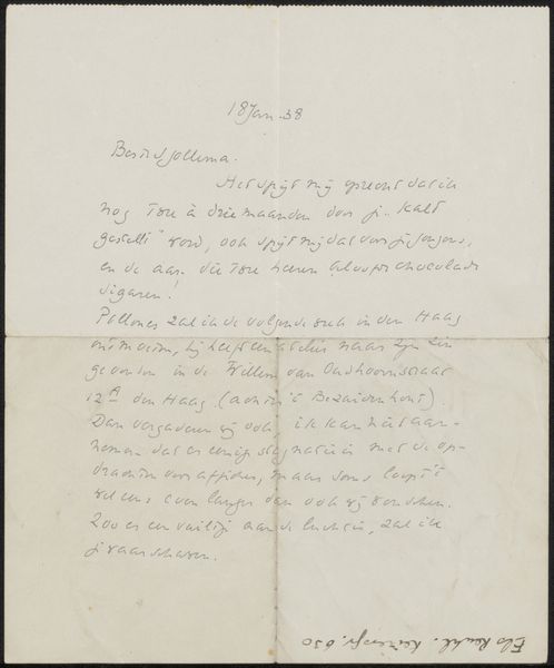 This letter, Brief aan Joop Sjollema, was written by Richard Nicolaüs Roland Holst on paper, but really, it’s so much more than just a note. Look at the texture of the paper, slightly crumpled and aged, it feels precious, doesn’t it? The handwriting is delicate, almost spidery, with loops and swirls that give it a life of its own. You can imagine the artist, pen in hand, carefully forming each word, each letter a tiny gesture. There is an intimacy in the way these marks are put down, like a whisper across time. That dark ink against the creamy paper, it's a simple contrast, but it’s so effective. It reminds me a little of Cy Twombly, in its casual beauty, but also of Hilma af Klint, in its personal symbolism. Holst uses the letter format in a similarly evocative and beautiful way. For me, this piece is a reminder that art can be found in the most unexpected places.