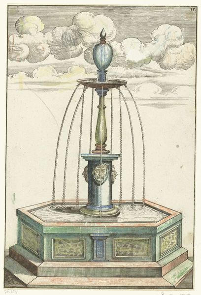 Curator: Right, let's talk about this remarkable 17th-century print titled 'Rond bassin op grote driepoot,' or 'Round basin on large tripod,' dating back to 1664. Editor: Well, immediately it makes me think of summer afternoons, sunshine glinting off water, maybe in a slightly overgrown Italian garden. It's utterly whimsical, isn't it? Almost like a stage set. Curator: I see that! The piece is rendered as an engraving—primarily on metal, which allowed for this really exquisite detailing of Baroque ornamentation, a key aesthetic of that period, right? Editor: Precisely! Notice the elaborate layering, the almost architectural solidity of the fountain. And those rather stoic little faces adorning the basin—they strike me as characterful little gargoyles guarding secrets. I am immediately drawn to how those lion paws anchoring it, that sort of stabilize a feeling of exuberance from all other elements. Curator: True, it's the foundation of that fantasy. The horses positioned centrally also draw our eye, with water almost creating a mane like effect. Editor: I hadn’t noticed that at first glance, almost camouflaged. Though they definitely imbue the work with such liveliness, despite them sitting fairly rigid, there's implied movement—it almost reminds me of characters frozen in the middle of a story or act. The contrast with the almost sterile cloud formation up top seems very stark to me though. Curator: Absolutely. It has almost a staged aesthetic that serves to underscore this construction. This work encapsulates the elaborate style of the era, the engraver likely sought to capture that splendor in accessible printed form. It's very characteristic of period cityscape engravings. Editor: You're spot on; and perhaps a little bit of that magic rubs off even now. It does speak to our need to decorate and cultivate spaces of tranquility even today, it gives us almost a sense of how historical periods perceived luxury and what we still retain and still think is magnificent. A celebration in etching is as potent now as it was back then!
