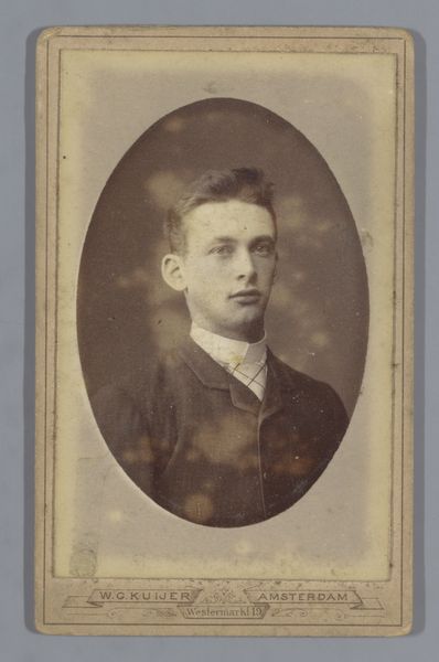 This photograph of an unknown man was taken by Willem Gerhardus Kuijer in Amsterdam, likely in the late 19th century. Small photographs like this were very popular at the time as affordable keepsakes, often collected in albums or exchanged amongst friends and family. Looking at the image, one can't help but wonder about the social context that made such a portrait possible. The rise of photography in the 19th century democratized portraiture, making it accessible to a wider segment of society than ever before. While painted portraits were once reserved for the wealthy elite, photographic portraits allowed people from various social classes to document their likeness and preserve their image for posterity. The institutional history of photography is also relevant here. Kuijer operated his studio from Westermarkt 11 in Amsterdam, becoming part of a network of commercial photographers who catered to the growing demand for portraiture. These studios played a crucial role in shaping visual culture. By researching archives, newspapers, and studio records, we can better understand the social and cultural significance of these seemingly simple images.