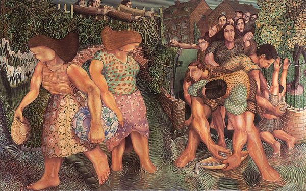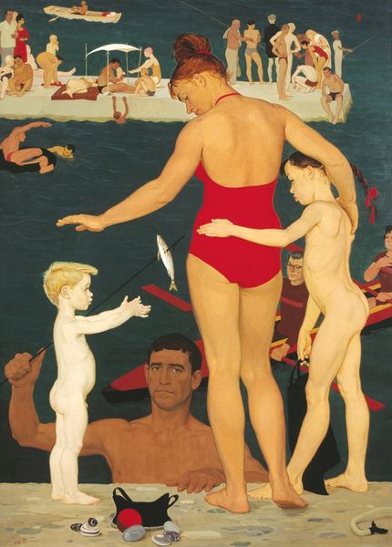 Editor: Here we have "Saturday Afternoon, Newport-" by Danny Galieote, it seems to be an oil painting portraying a crowded beach scene. What strikes me is the odd sort of, flattened perspective and the stylized way the figures are rendered. What's your take? Curator: The artist's manipulation of perspective immediately draws my attention to the artificiality of the scene. These are clearly constructed figures within a fabricated environment, emphasizing the labour and process involved in image making. How does the hyper-real finish of the oil paint contrast with the strangely unrealistic composition? Editor: It's almost unsettling! It makes you question the "realism" style, and how constructed even realist images can be, and that is made of paint manufactured and sold at an industrial scale! Curator: Precisely! We see not just the leisure activities depicted but also the socio-economic realities that allow such leisure to exist. What role do you think consumption plays in this scene beyond the obvious, such as swimwear, etc? Look closely! Editor: Oh, there's a Coke bottle right in the foreground. The brand name so prominently displayed points to consumer culture defining the scene. The mass-produced drink is a crucial material element. Curator: Yes, the inclusion of that specific product situates the scene within a network of commerce and branding. The materiality of leisure itself becomes apparent. How does it challenge ideas about "high" and "low" culture in art, do you think? Editor: Well, bringing in everyday consumer items challenges this distinction by elevating them to the level of artistic subject matter. So what do you think Galieote wanted us to understand about materiality in modern life with this artwork? Curator: I think it questions the role of mass production and manufactured objects in the experience of everyday leisure, blurring lines between lived experience and commodified imagery. And, in turn, the viewer's experience of looking is implicated as just another mode of consuming images. Editor: I'm definitely seeing more in this painting now, considering the manufactured aspects of even something as simple as a beach day, and its relationship with capitalistic making. Thank you.