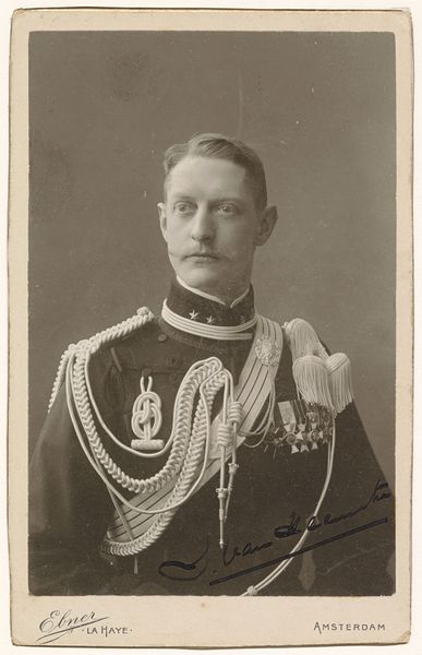 Editor: Here we have a gelatin-silver print, a portrait titled *Arthur Moos in uniform van het 20e regiment Uhlanen, Ludwigsburg,* created around 1905 or 1906. There's something very stoic and formal about it; you can feel the weight of history just looking at him in that uniform. What strikes you about this photograph? Curator: What stands out is precisely that posed formality, common to portraits of the era, especially within military contexts. This wasn't just about documenting an individual; it was about projecting an image of power, duty, and belonging to a larger entity—in this case, the 20th Uhlanen Regiment. Consider how the crisp uniform, the elaborate helmet, and even the man's controlled posture contribute to this construction. How might this image have functioned in society at the time? Editor: Maybe as propaganda? Or perhaps just a memento for the family? I guess both aren't mutually exclusive. Curator: Exactly. Think about the rise of nationalism in the late 19th and early 20th centuries. Uniforms and military service became potent symbols of national pride and unity. Images like this circulated widely, reinforcing these ideologies. At the same time, you're right, it serves a personal function for remembrance. Do you think knowing it's a photograph changes how we read this image, as opposed to a painted portrait? Editor: Well, I guess there's an assumption of "truth" that comes with photography. People tend to believe photographs record reality, even though staging and posing are involved here. I mean, the reality is carefully constructed. Curator: Precisely. And that interplay between perceived reality and constructed image is where the real interest lies, especially when we consider the social and political functions this kind of portrait served. The photographic portrait democratized the representation of power but also controlled its distribution and interpretation. Editor: I hadn't really considered all those layers of meaning embedded within what seems like a simple portrait. I'll definitely look at these kinds of images differently from now on. Curator: Indeed, it's important to consider how these types of photographies are embedded with so much intention in social history.