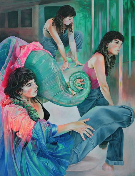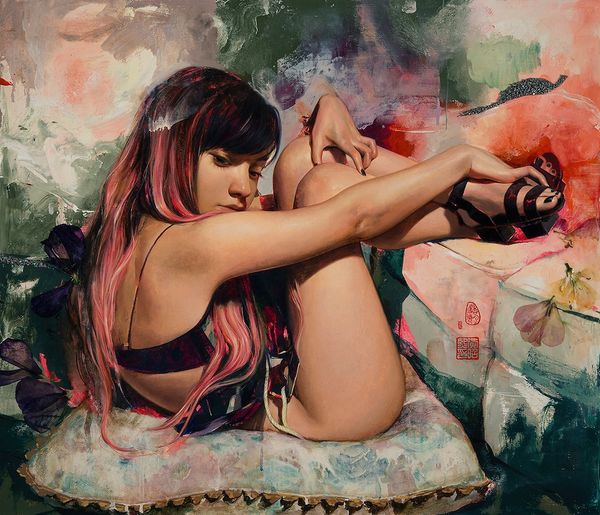 Editor: So, here we have "Earthlings," a 2015 acrylic painting by Soey Milk. It's captivating! I find myself drawn to its intimate, almost dreamlike quality and, I'm intrigued by the ambiguity of the space they occupy, and wonder, what story do you think Milk is trying to tell us? Curator: Oh, that's a juicy question! For me, "Earthlings" isn't about a literal narrative but rather, it captures a feeling, a state of being. Notice how the figures are intertwined, almost dissolving into the surrounding environment? The artist seems less interested in precise details than she is with evoking a sense of connection – a bond between these women and perhaps also with the natural world around them. Do you see how those sprigs of rosemary become almost another character? Editor: That's interesting! I hadn’t really thought of that before – how the foliage almost has a presence of its own. Does that botanical integration reflect in the theme? Curator: Exactly. She invites you into their private world. A secret language unfolds as they lie tangled in soft fabrics. Editor: Now that you point that out, I find I get the sense of these figures are almost a single unit, rather than two separate people. Like a complex flower! It's funny, I initially found the painting to be intriguing and that I can keep re-looking and re-seeing the artwork, how fascinating and clever, it definitely makes the painting unforgettable! Curator: Absolutely, art helps you understand more about yourself. This painting truly does have its own pulse; I think you said it best, these Earthlings make for something unforgettable.