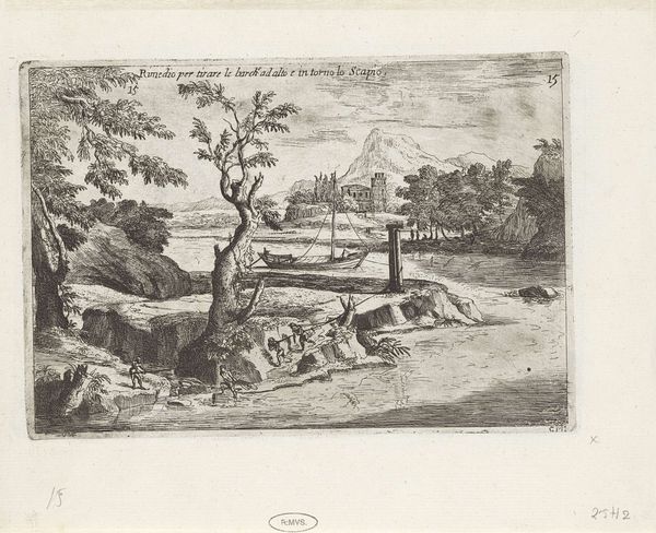 Curator: Immediately, I'm struck by the idyllic atmosphere. There's something quite charming about this tranquil village scene rendered in such detail, considering the modest size of the engraving. Editor: This engraving, known as "Dorpsgezicht met stenen bruggetje," or "Village Scene with a Small Stone Bridge," is attributed to Anthonij van der Haer and likely dates from around 1745 to 1785. It’s a fantastic example of the kind of landscape imagery popular during the Dutch Golden Age, even though its production was later. Curator: The artist’s use of line is quite remarkable. Notice how varying the density and direction of the marks creates texture and suggests light and shadow across the composition. The textures, while appearing simple, are richly varied when examined closely. Editor: The presence of a church positioned prominently in the background certainly tells us something about the societal values of the time. These scenes weren’t just picturesque; they projected ideals of order, piety, and prosperity—visual cornerstones of the developing Dutch identity. It seems to imply some idealization of the artist. Curator: I agree, and it contributes to the feeling of serene observation. There’s a certain detachment—we're given access to this quaint tableau as outside viewers, removed from its quotidian realities. Editor: Indeed. And it's fascinating to see how such images became emblematic of Dutch cultural confidence. Printmaking allowed for the widespread distribution of such scenes, effectively propagating certain cultural values and social norms far beyond the village itself. In a way, we’re looking at a carefully constructed form of cultural propaganda. Curator: A fitting point, particularly when we observe how balanced the composition is. We can perceive visual harmony through symmetry which evokes themes of community and faith. Editor: Examining such a piece encourages one to look deeper into the relationship between artistic representation and societal formation, and to appreciate both the aesthetics of the image and the narratives embedded within it. Curator: I concur, allowing us to see the intersection of personal artistry and the wider public sphere is really eye-opening.