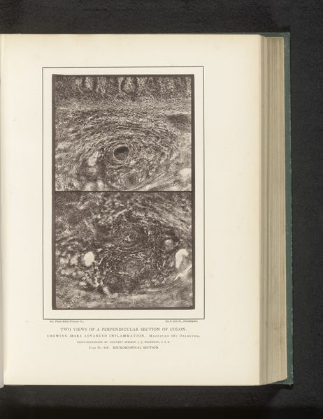 Curator: Here we have an intriguing print, "Twee vergrotingen van een ontstoken onderlaag in een stuk dikke darm"—or, "Two enlargements of an inflamed underlayer in a piece of large intestine." It dates to before 1879 and is credited to Joseph Janvier Woodward. Editor: My first impression is one of almost unsettling beauty. The intricate textures, like layers of sediment in rock formations, possess a strange aesthetic appeal despite the subject matter being… well, inflamed intestine. Curator: Absolutely. Woodward’s work sits at the intersection of scientific advancement and the art world's expanding field of subjects. Mid-19th century advancements in microscopy and photography presented new methods of observing and recording the world, influencing art's traditional boundaries and redefining what constituted an acceptable artistic subject. Editor: Exactly. Looking closely, you can see how the medium contributes to this dual identity. It’s graphite and print on paper; the paper itself seems aged. The labour-intensive process of creating this hyperrealistic depiction, particularly its original creation, underscores a dedication to accuracy… a tangible dedication that transcends the sterile confines of a medical textbook. Curator: The image reflects the prevailing fascination with realism at the time and is connected to larger shifts within medical institutions. They began employing artists to document and disseminate visual representations of pathology. Woodward himself served as a medical photographer, pushing these boundaries institutionally. Editor: But I wonder, what about the patients? There’s something inherently removed from a piece like this. It focuses so intently on material analysis and the craft of visual replication; one might say it’s fetishistic, with focus placed on craft, materiality and objective presentation. How was the act of collecting these samples viewed and experienced during that era? Curator: Indeed, it opens a vital discussion about ethical boundaries in medical documentation. It existed to train doctors and share observations, with little, or perhaps, no attention paid to the patient whose suffering is being magnified. This points toward unequal distributions of medical knowledge that often reproduced socio-political power. Editor: This gives the picture so much to consider regarding both beauty and suffering... Thank you! Curator: Indeed, a great start! It’s important to confront not only the beauty, but also the history and cultural moment such that the conditions of art and scientific study can come together.