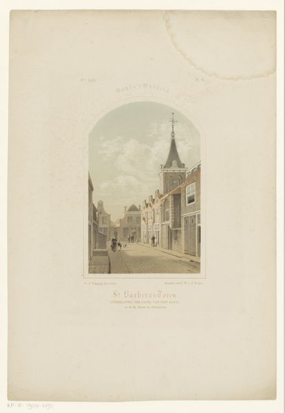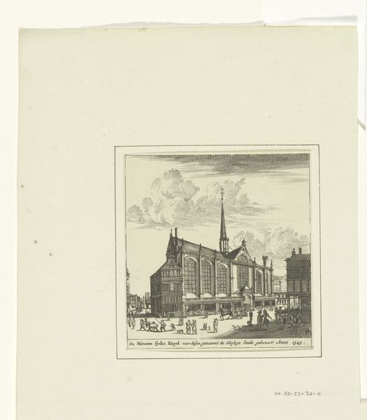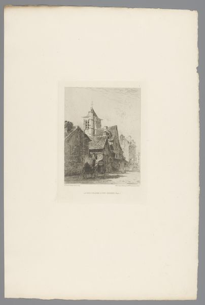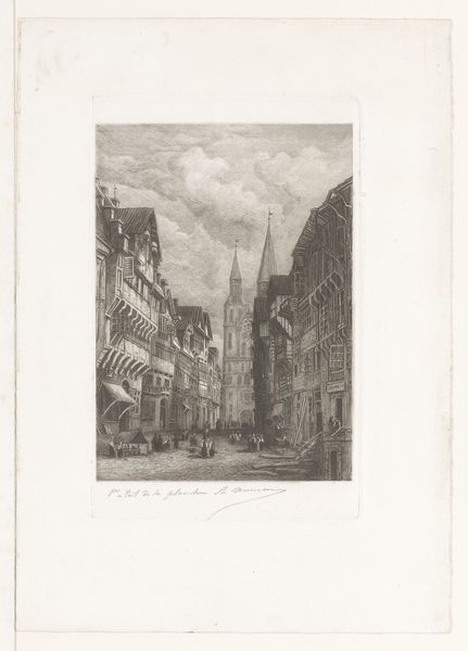 Curator: Let's consider this etching by Théodore Fourmois, "Stadsgezicht met kerk," placing its creation somewhere between 1824 and 1871. It’s currently held in the Rijksmuseum. What's your immediate response to this cityscape? Editor: My immediate reaction is a feeling of profound quietude and the sheer looming dominance of that church. You can almost hear the echoes of footsteps on the cobblestones, emphasizing the ordinary life happening in the shadow of established religious power. Curator: Indeed. Understanding that context, Romanticism was in full swing then. Fourmois uses the city as a tableau to reflect broader social dynamics and human scale amidst overwhelming structures. What narratives do you think he's trying to engage in the social sphere of that period? Editor: Considering it's an etching on paper, his choice of the medium itself suggests an intention toward accessibility, mass production and even a sort of democratisation of landscape art. It allows for wider dissemination, so this isn’t just an aesthetic experience, but a material object entering circulation. Curator: Absolutely. It underscores Romanticism’s dual focus on nature and the importance of community. Notice how he renders light—the somber hues add an introspective quality that aligns with artistic identity. There's a powerful tension between progress and preservation, a silent dialogue present in the streets themselves. What statements do you think the use of specific materials may evoke? Editor: The fine lines achieved through etching, combined with the subtle gradations of tone, suggest labor, care, and detail oriented work. It connects to ideas of value through labour, reflecting societal perspectives on artistic worth and even the church. Curator: That connection between labor, the church, and artistry resonates deeply, especially within the societal landscape. I think you have nailed the implications of the labor used to create it, within its historical moment. What we make from and of the piece speaks volumes about shifting cultural attitudes. Editor: Ultimately, its impact for me, rests not just in its aesthetics, but how that accessibility creates possibility. I found myself contemplating labor in contrast with what now feels like fleeting cultural conditions.