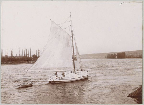 Editor: Here we have an untitled photograph, *Zeilboot op het Bodenmeer,* which translates to "Sailboat on Lake Constance," taken around 1929. It’s a very tranquil scene. What draws my attention is the stark contrast of the sailboat against the softly blurred background. What do you see in this composition? Curator: The interplay of light and shadow certainly creates a striking visual dichotomy. Notice how the photographer utilizes the geometry of the sail—its triangular shape acting as a primary structural element. This sharply contrasts with the horizontal plane established by the water and distant shore. How does this relationship affect your reading of the artwork? Editor: I see what you mean. The sharp lines of the sail pull my eye upward, while the horizontal lines give the image stability. Do you think that the artist might have deliberately chosen this angle to emphasize the boat's movement, contrasting it against the stable horizon? Curator: It is certainly a tenable interpretation. The artist, through the careful selection of viewpoint and focus, constructs a visual narrative of motion within a framework of stability. Consider the tonality; the subtle gradations from light to dark across the sail contribute to the illusion of depth, further animating the scene. Editor: That’s fascinating! Focusing on just the formal elements really unveils layers I hadn't noticed before. Thanks for illuminating the piece! Curator: Indeed. It is often in the deliberate manipulation of form that the artist communicates most effectively. Considering how formal structure and geometric play impacts the viewer enhances one’s reading.