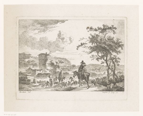 Curator: This etching, “Ezeldrijver in een kustlandschap,” which translates to “Donkey Driver in a Coastal Landscape,” was created in 1811 by Pierre François De Noter. Editor: There's such a stark contrast between the delicate, almost lace-like rendering of the tree on the right and the somewhat harsher, more angular lines used for the ruined tower and mountains in the background. It creates an interesting tension—a sense of decay juxtaposed with natural growth. Curator: Indeed. The imagery presents several archetypes typical of the Romantic movement. Notice how the ruined tower can be interpreted as representing the transient nature of human endeavors, particularly when compared to the natural grandeur suggested by the distant mountains. What do these symbols represent within a context of the era's sociopolitical changes? Editor: It's impossible not to consider it within the Napoleonic context. De Noter was working during a period of significant political upheaval in the Netherlands, and such a stark landscape, combined with a crumbling tower, speaks to ideas of societal decay, and the vulnerabilities of structures, of governance. It echoes a romanticized ideal of a simpler existence, as embodied by the peasant with his donkey. Curator: Absolutely. Consider, too, how the tree, firmly rooted and reaching upward, serves as a symbol of resilience and continuity. Even the donkey driver evokes biblical themes of humility and labor. How would it contrast, do you think, with other imagery of the era depicting opulence and nobility? Editor: Radically. We see this figure, small within the grandeur of the landscape, but still central to the composition. There is labor happening within this ruined world. De Noter subtly subverts the typical power dynamics seen in art, by focusing on the life that carries on, despite ruin, despite upheaval, and who contributes to what comes next. The small boat at sea perhaps offers an alternate vision for this future. Curator: Precisely. The imagery contains a message of strength and continuity, told via careful selection of symbolic forms. And the donkey becomes an unlikely, but powerful representation of progress and adaptation. Editor: It pushes me to consider who builds and rebuilds after every collapse, both literal and metaphorical. I’ll hold that message close.
