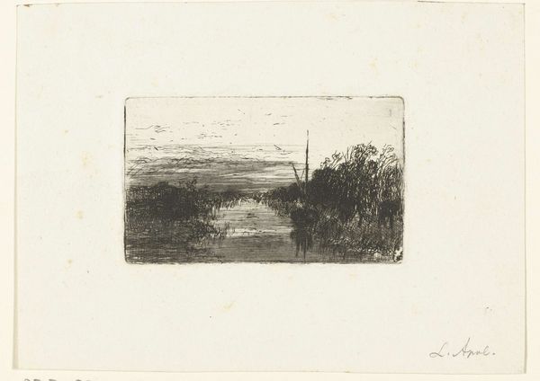 Curator: Today, we're looking at "View of the Meuse near Jupille," an etching by Théodore Tscharner, dating roughly from 1836 to 1906. Editor: It’s strikingly bleak, almost desolate. The stark monochrome lends a melancholic air, wouldn't you say? It is as if a storm has just passed or is gathering momentum over the water. Curator: Indeed, Tscharner's expert handling of etching creates a textured surface, rich with tonal variation. Notice the interplay of light and shadow, achieved through carefully controlled lines and cross-hatching, especially in the treatment of the sky. How does that speak to you? Editor: The sky dominates. I’m curious how the artist's choice to emphasize the looming sky might be reflective of broader anxieties during this period – perhaps related to industrialization or societal upheaval. Landscape as a site of tension rather than tranquility. Curator: Interesting proposition! The work embodies several styles including both Realism and Romanticism. The subject matter – the river and its surroundings – grounds the artwork in observable reality, but Tscharner elevates the subject with expressive line work, giving rise to a more heightened, subjective experience. It merges precise rendering with emotionally resonant mark-making. Editor: This blending of styles definitely contributes to the piece's complexity. Given the time period of its making, perhaps the print comments on society’s growing reliance on extraction and fossil fuels by illustrating humanity's dependence on natural resources and waterways, a commentary on human innovation and its potential dangers to the Earth. Curator: I can definitely perceive a thematic tension through a contemporary lens. It is a testament to the enduring power of art to provoke introspection. I wonder, does that shift how we understand the river represented here? Editor: Absolutely. We begin to question its exploitation in favor of imagining a reality where natural conservation is prioritised over technological progress. It speaks directly to our times and concerns. Curator: Tscharner’s composition allows us to ask pressing questions that persist across the ages. Thank you for bringing your perspective to the work today. Editor: My pleasure. I think that interrogating the narratives we accept empowers everyone.